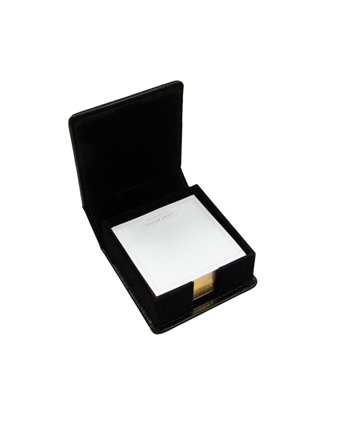 Cream sticky notepad featuring double line design and From The Desk Of and Taylor Swift with box design printed at top of each notepad page and black leather notepad holder with TTPD album logo and The Tortured Poets Department printed on front in gold foil and Taylor Swift with box design printed on back in gold foil.