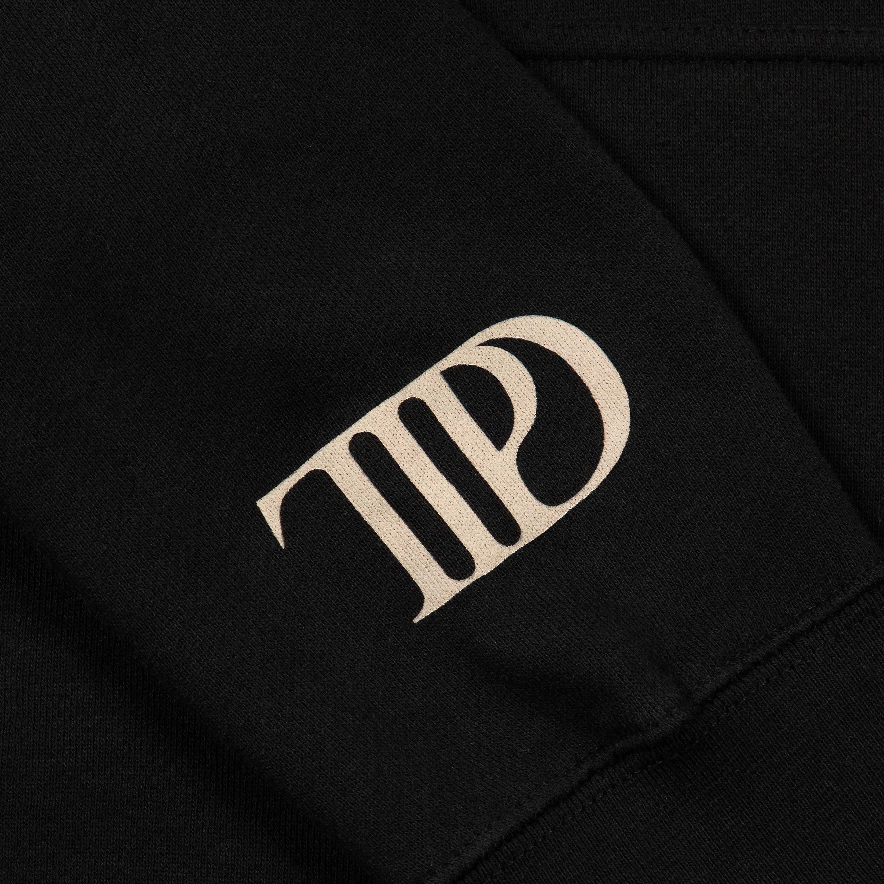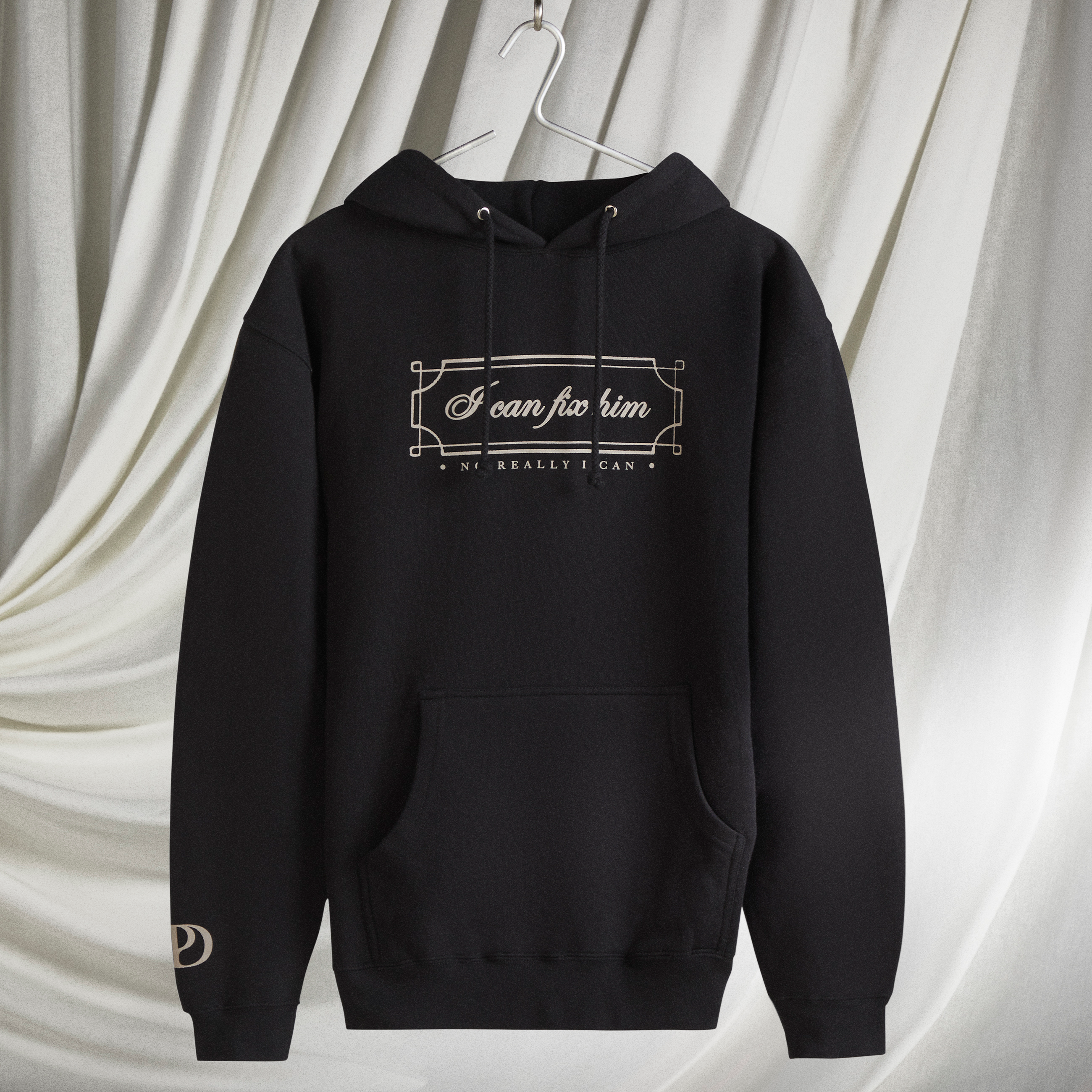 Black hoodie with front pocket featuring double line box design with I Can Fix Him No I Really Can song lyrics printed on front and TTPD album logo on wearer’s right sleeve.