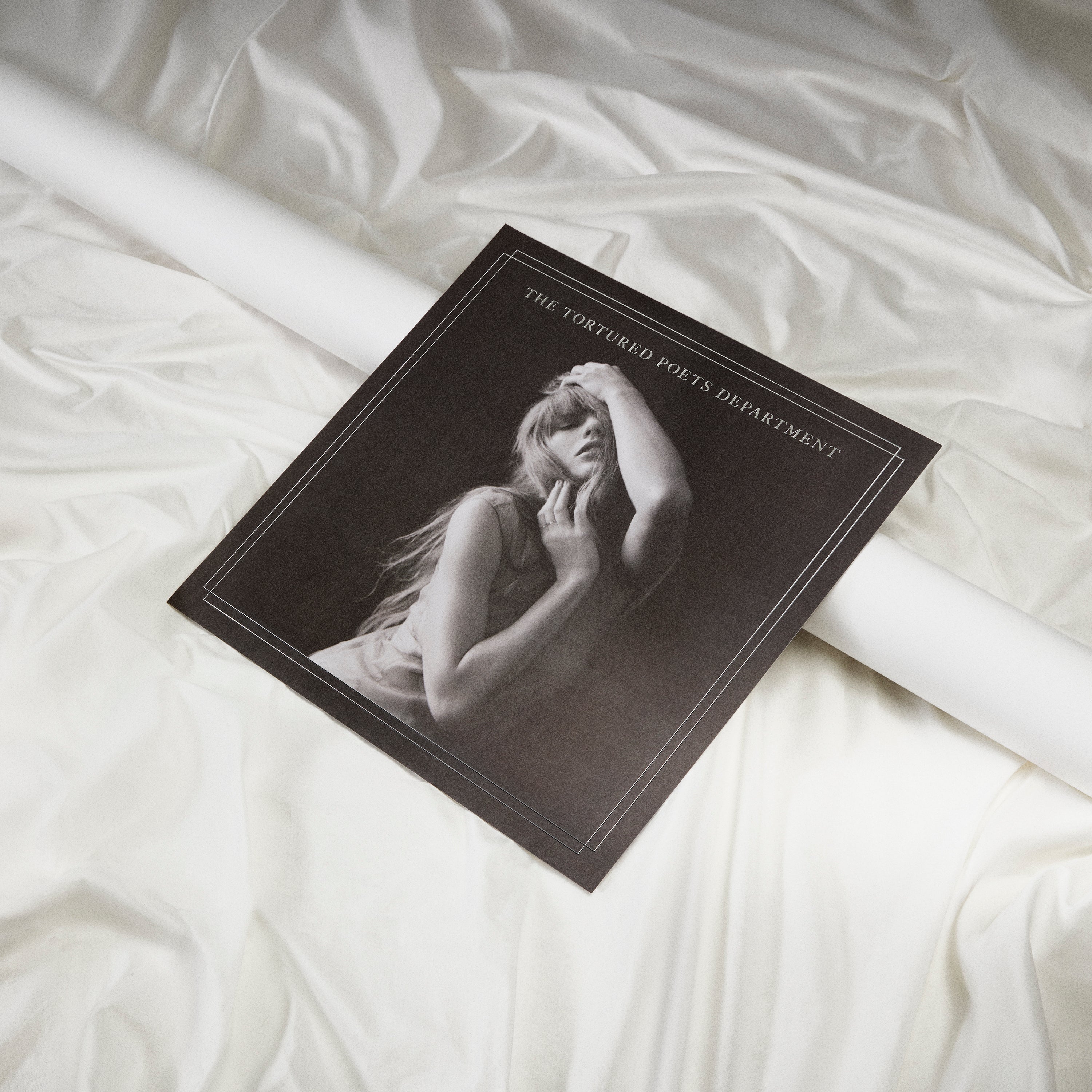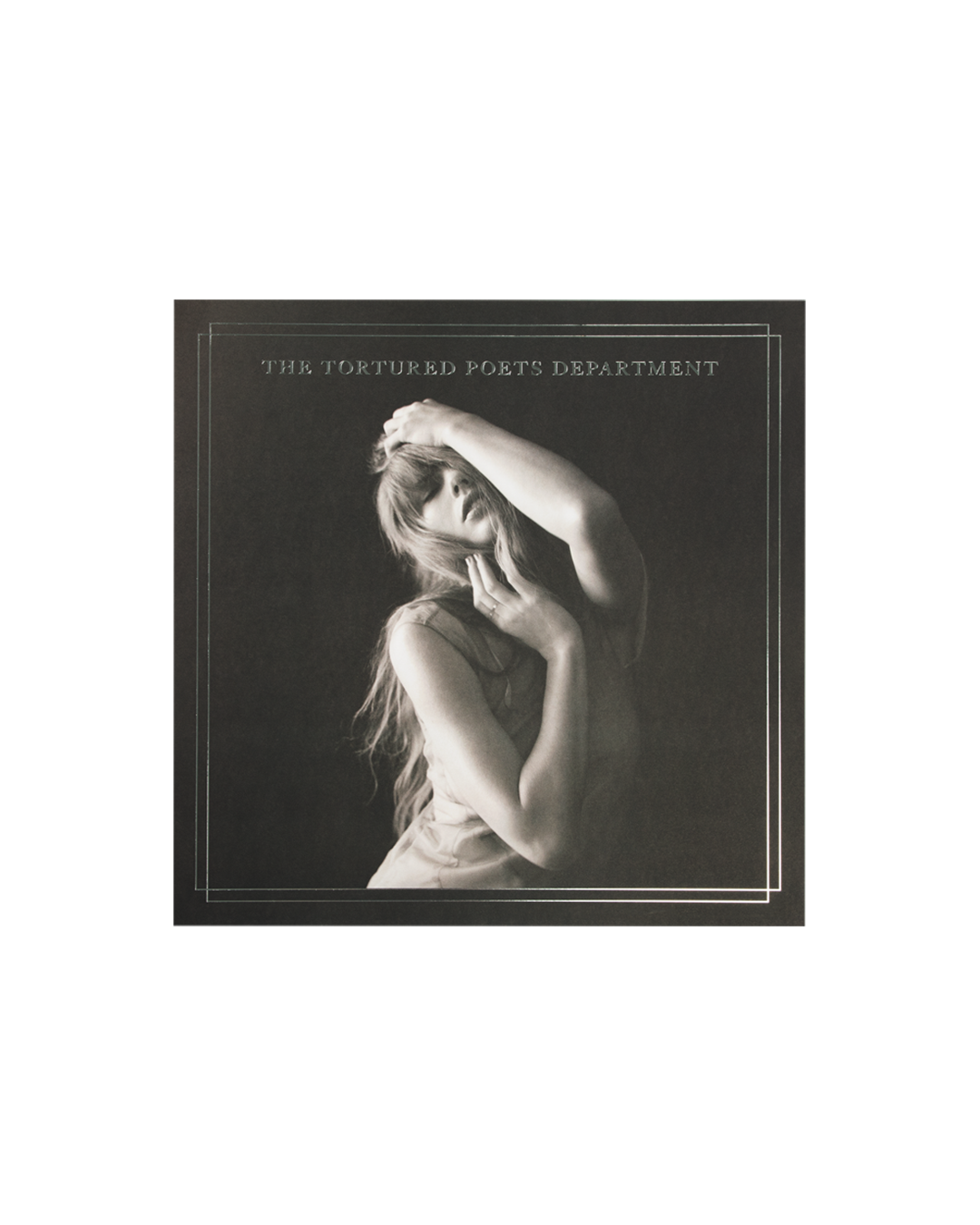 Matte black print featuring photo of Taylor Swift. double line design. and The Tortured Poets Department printed on front.